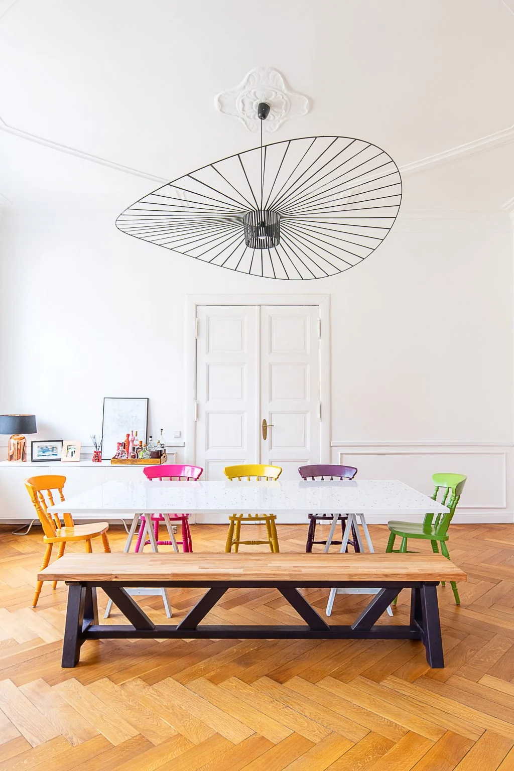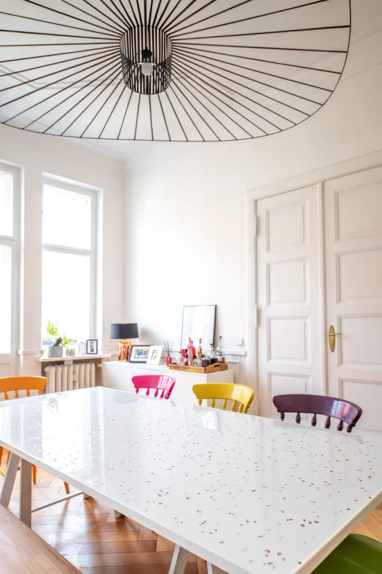 El terrazo es duradero y resistente a ralladuras, manchas o grietas, además de ser fácil de limpiar, lo que lo convierte en una opción ideal para cocinas (donde la higiene es clave). Christine & Jan (Little House on The Corner) diseñaron una encimera con efecto terrazo utilizando resina y arcilla de modelado de distintos colores—el resultado fue impresionante. Aun así, para quienes prefieren facilidad, envolver con película es una alternativa más simple y efectiva.