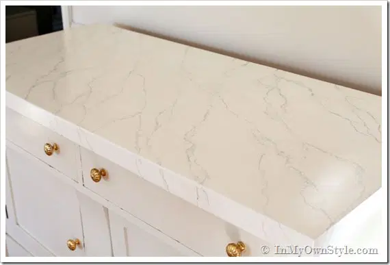 Si tu presupuesto no contempla encimeras nuevas, una solución creativa es imitar el mármol mediante pintura. Un ejemplo es el proyecto de Diane (In My Own Style), quien creó una encimera tipo Carrara falsa usando pintura acrílica. Los pasos generales:
